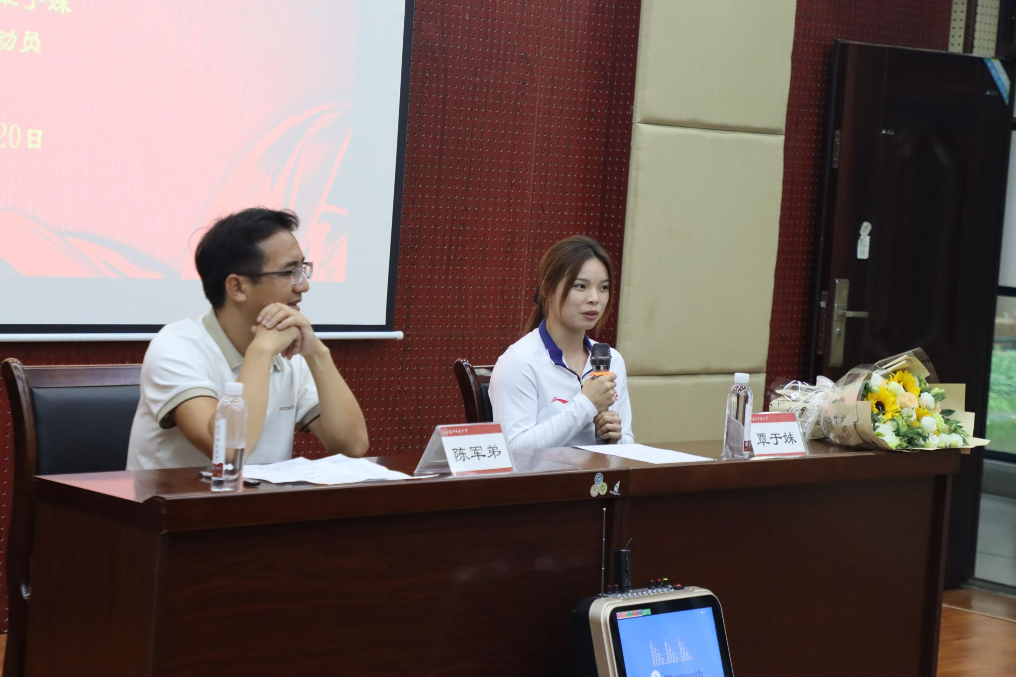 活动伊始,陈军弟副书记热情地介绍了覃于妹的双重身份,他自豪地表示:“今天站在讲台上的,不只是为国争光的运动员,也是我们体育与健康学院大家庭的一员。覃于妹同学将世运会的风采带回了课堂,是全体师生学习的榜样。” 这番话引来了全场热烈的掌声。