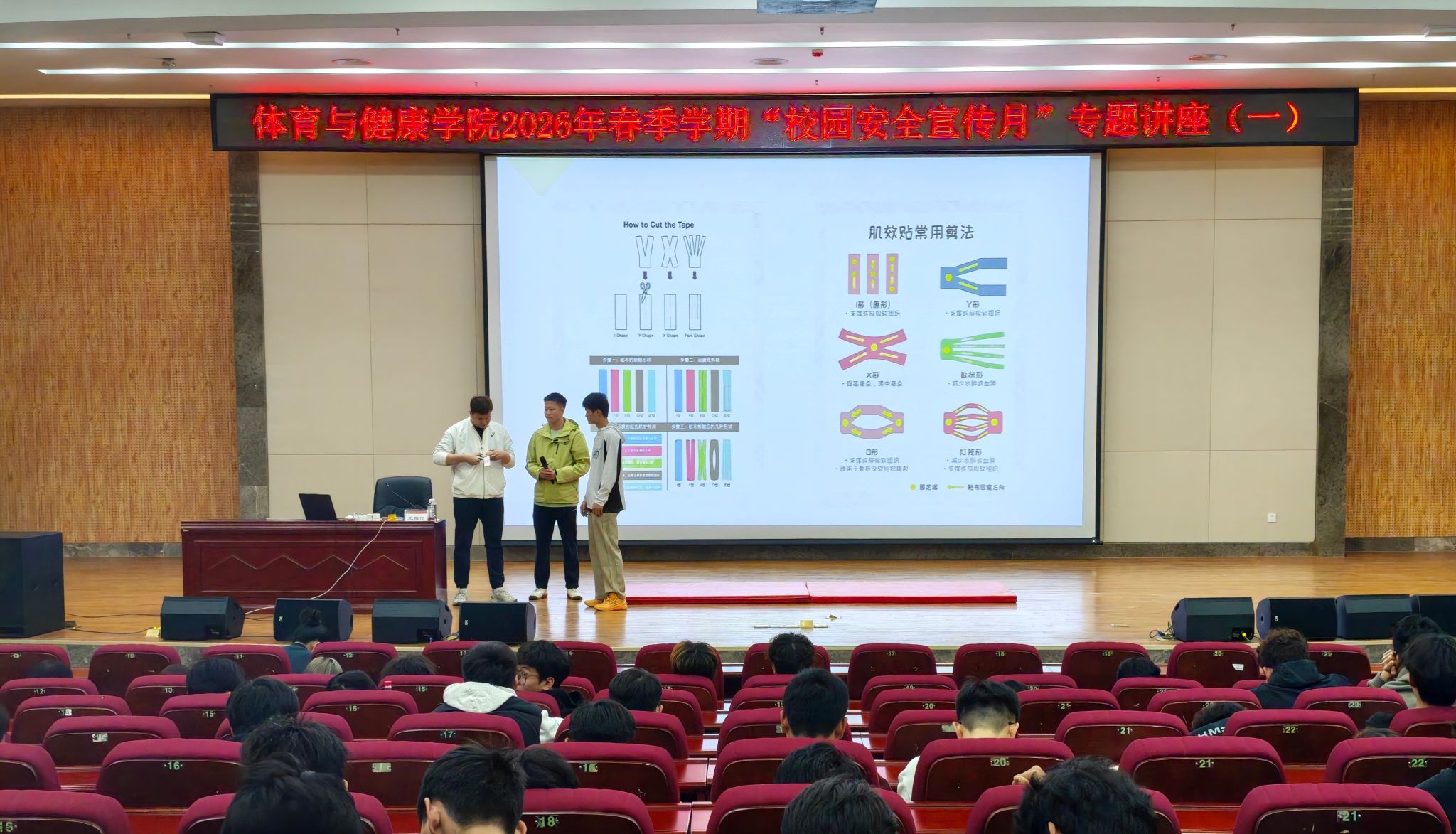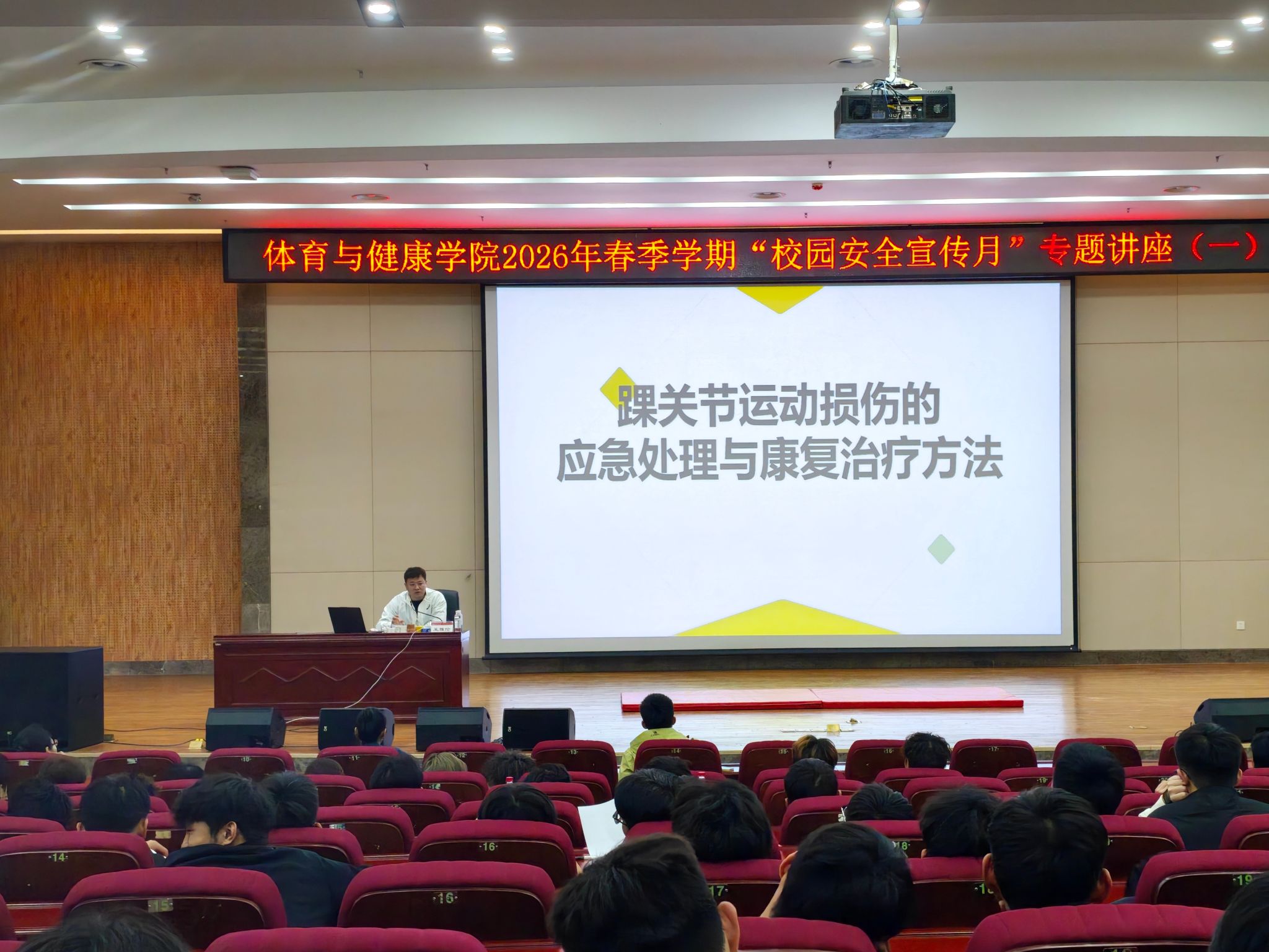 为深入贯彻习近平总书记关于安全生产的重要论述,全面落实校园安全管理工作要求,切实提升体育专业学生的运动安全意识和应急处置能力,3月12日晚,体育与健康学院2026年春季学期“校园安全宣传月”首场专题讲座在武鸣校区图书馆报告厅顺利举行。本次讲座特邀我校专业教师(原国家田径短跑队、广西田径运动发展中心康复治疗师及队医)王雅伦老师担任主讲,学院2023级、2025级本科生及研究生共300余人到场学习,现场气氛热烈,互动积极。