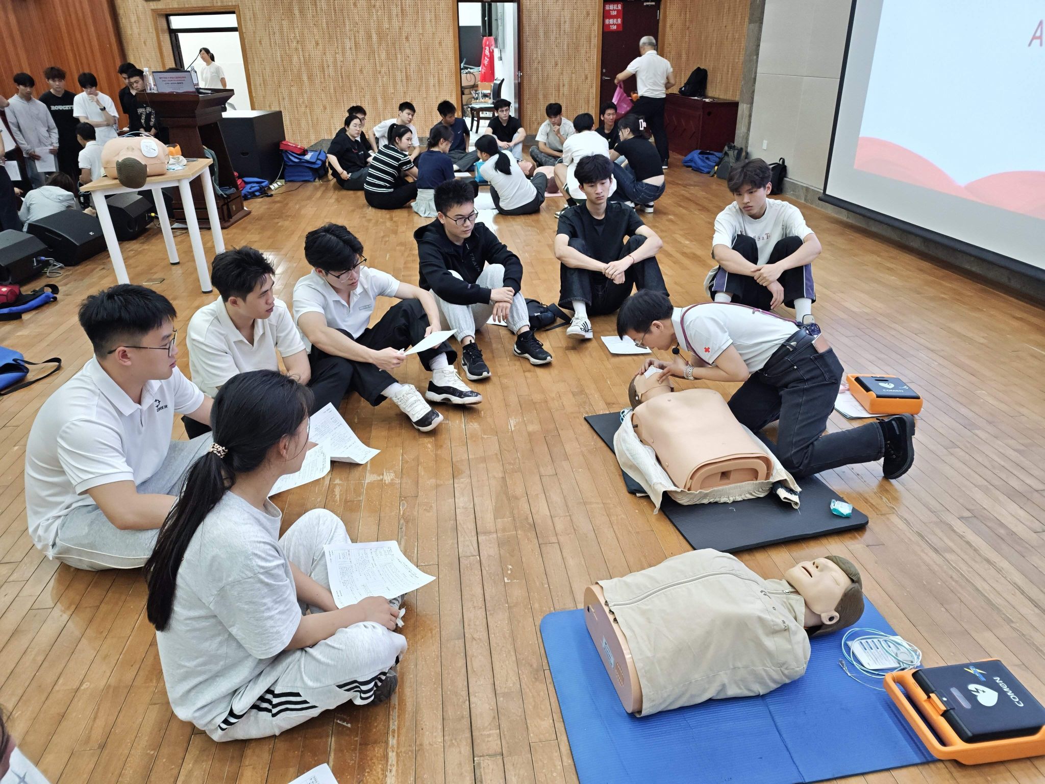培训特邀红十字会资深应急救护讲师担任主讲,围绕心肺复苏(CPR)、AED使用、创伤包扎、海姆立克急救法等校园高频急救场景,展开系统而深入的教学。讲师结合真实生动的案例,细致讲解急救原则、操作规范与注意事项,并通过示范演示与手把手指导,帮助参训师生迅速掌握核心施救技能。