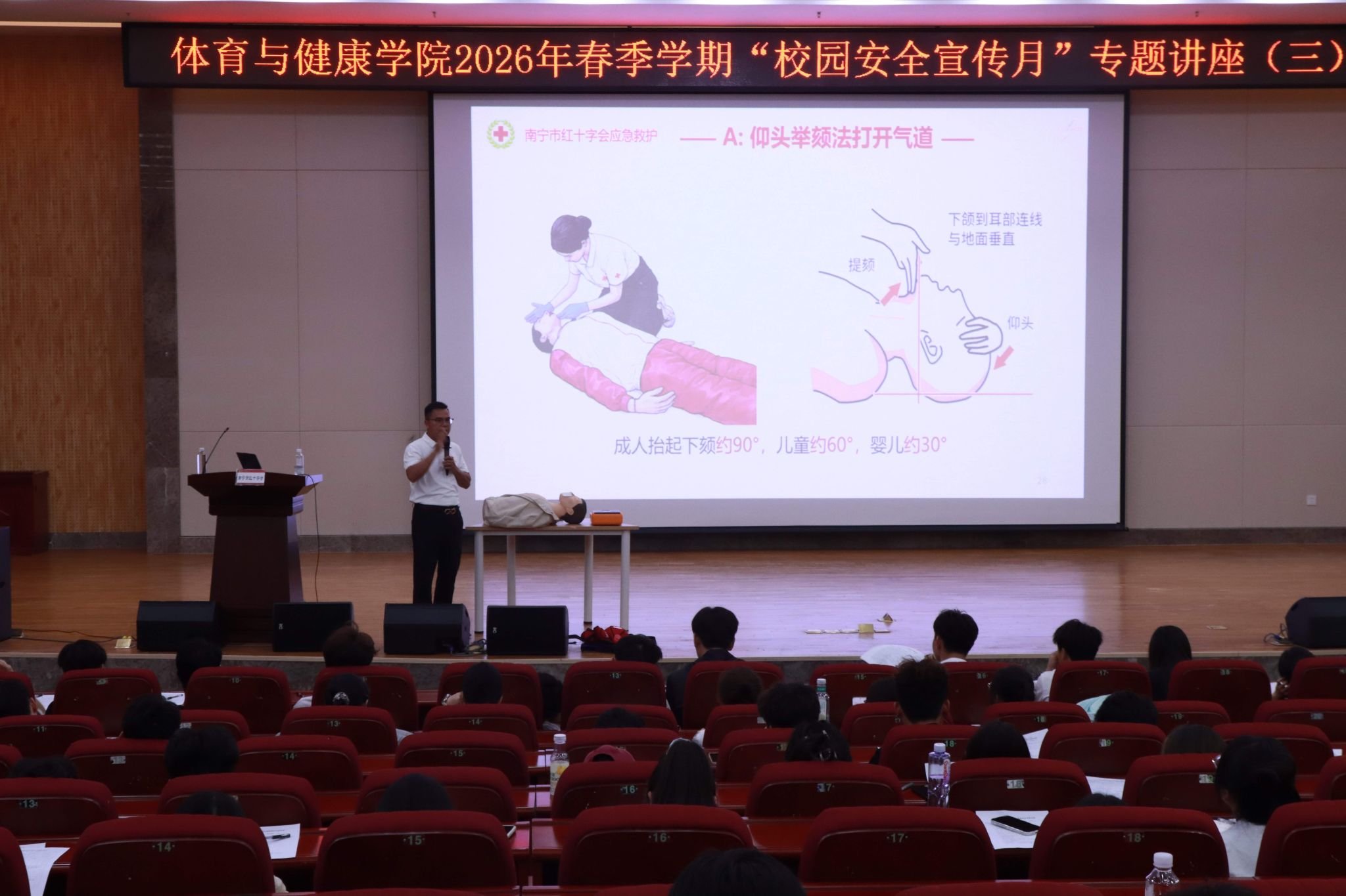 为切实增强师生安全意识,提升校园突发状况下的自救互救能力,筑牢平安校园的坚固防线,3月31日14:30,体育与健康学院在武鸣校区图书馆报告厅成功举办应急救护专题培训。本次培训吸引了学院300名学生踊跃参与,采用理论授课、实操演练与分组考核相结合的方式,让急救知识入脑入心,使关键技能学以致用。