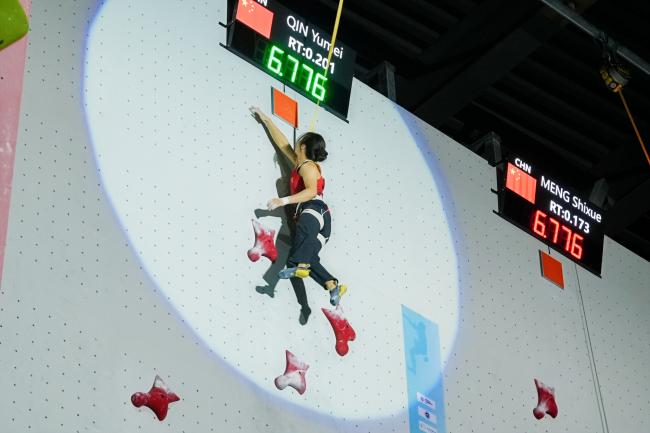 女子速度项目对决精彩纷呈。预赛排名第一的印度尼西亚名将德萨克·迈德·丽塔·库苏马·德维(Desak Made Rita Kusuma Dewi)一路领先,在半决赛与决赛中先后以 6.15 秒、6.07 秒两度刷新女子速度攀岩亚洲纪录并摘得金牌。我校学子覃于妹发挥稳健,最终摘得铜牌。